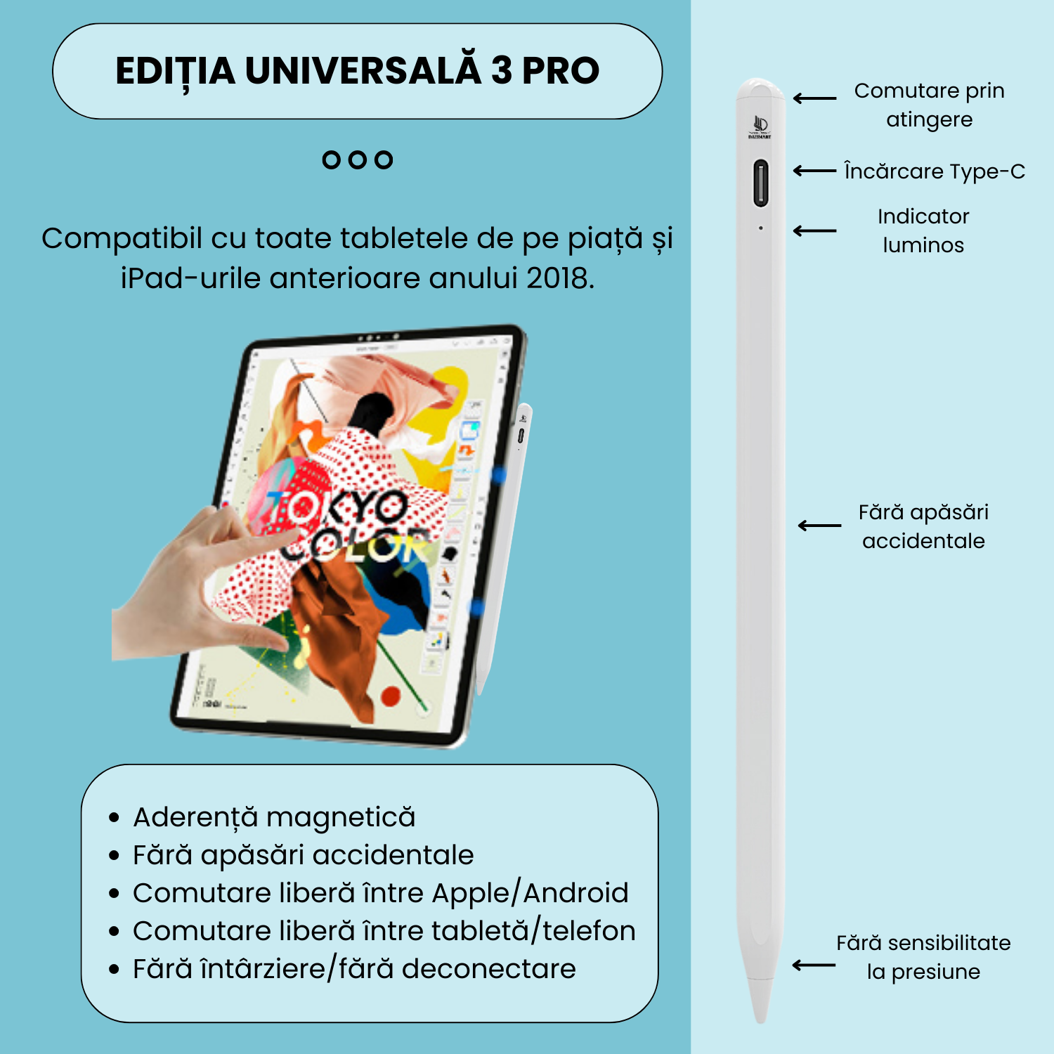 - Compatibilitate Universala: Stiloul este compatibil cu majoritatea dispozitivelor Android si iOS, fiind perfect adaptat pentru telefoane si tablete. Nu necesita incarcare sau conectare prin Bluetooth, fiind gata de utilizare imediata.