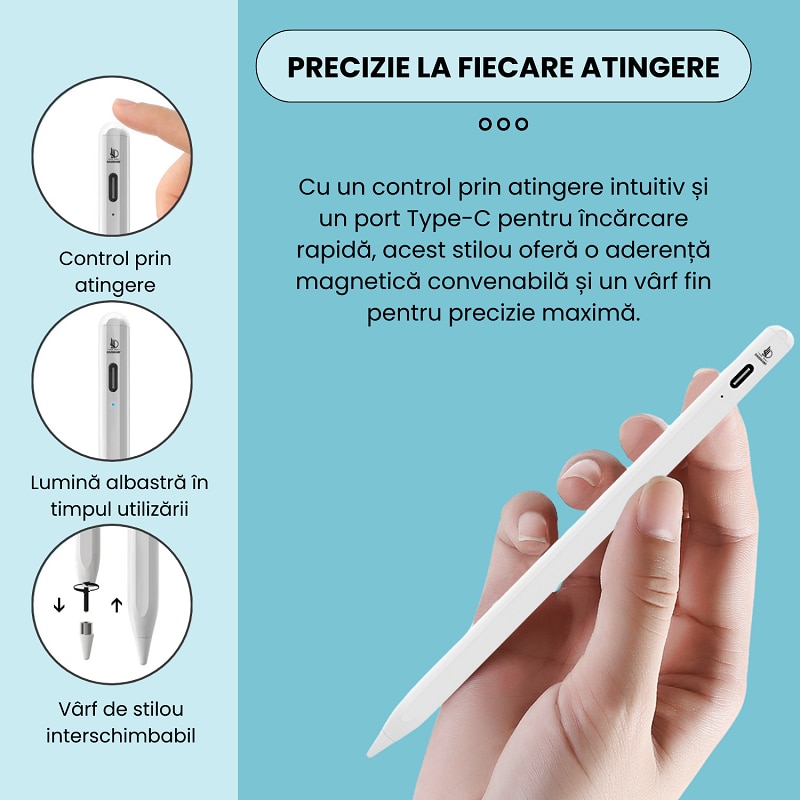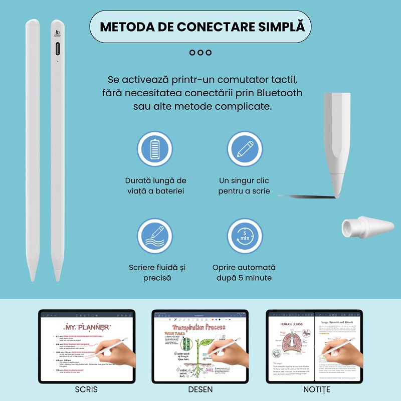 - Sistem de Economisire a Energiei: Stiloul se opreste automat dupa 5 minute de inactivitate, asigurand o utilizare eficienta a bateriei.